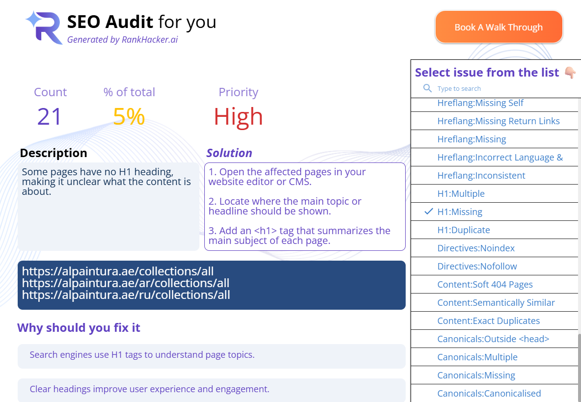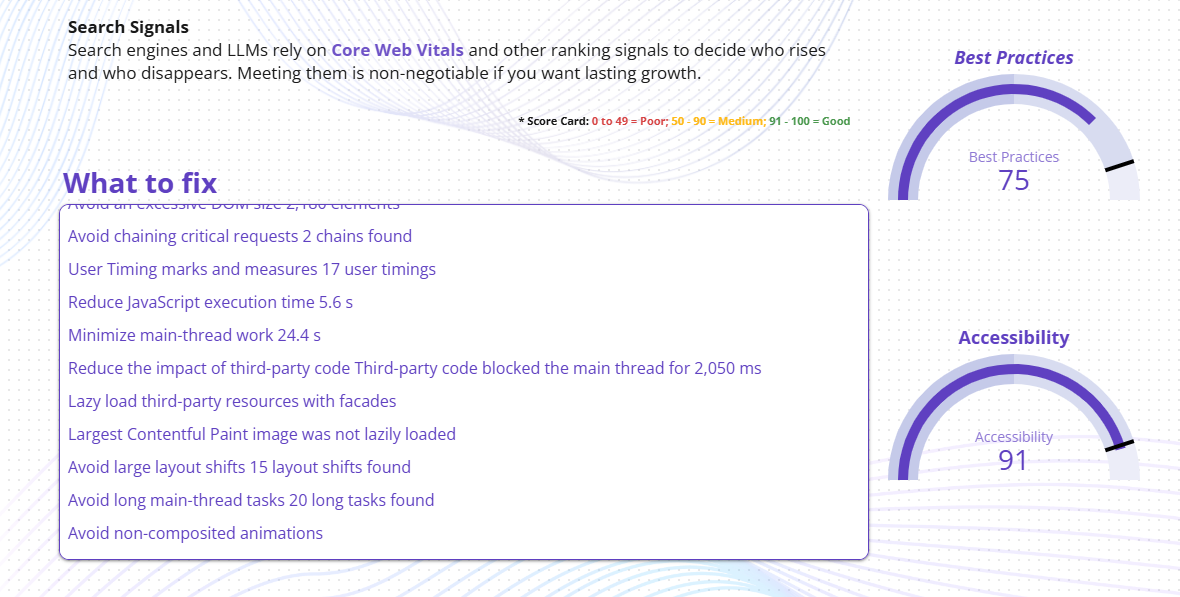 Our audit goes beyond surface-level checks, it scans your entire site the same way Google and AI engines do. We’ll uncover the highest-impact technical issues slowing down your rankings, from missing H1 tags and broken links to crawl errors, duplicate content, and more. Every issue is clearly explained in plain language, with context on why it matters, how it affects performance, and what to do about it. Each one is ranked by priority and business impact, so you’ll always know what to tackle first.
