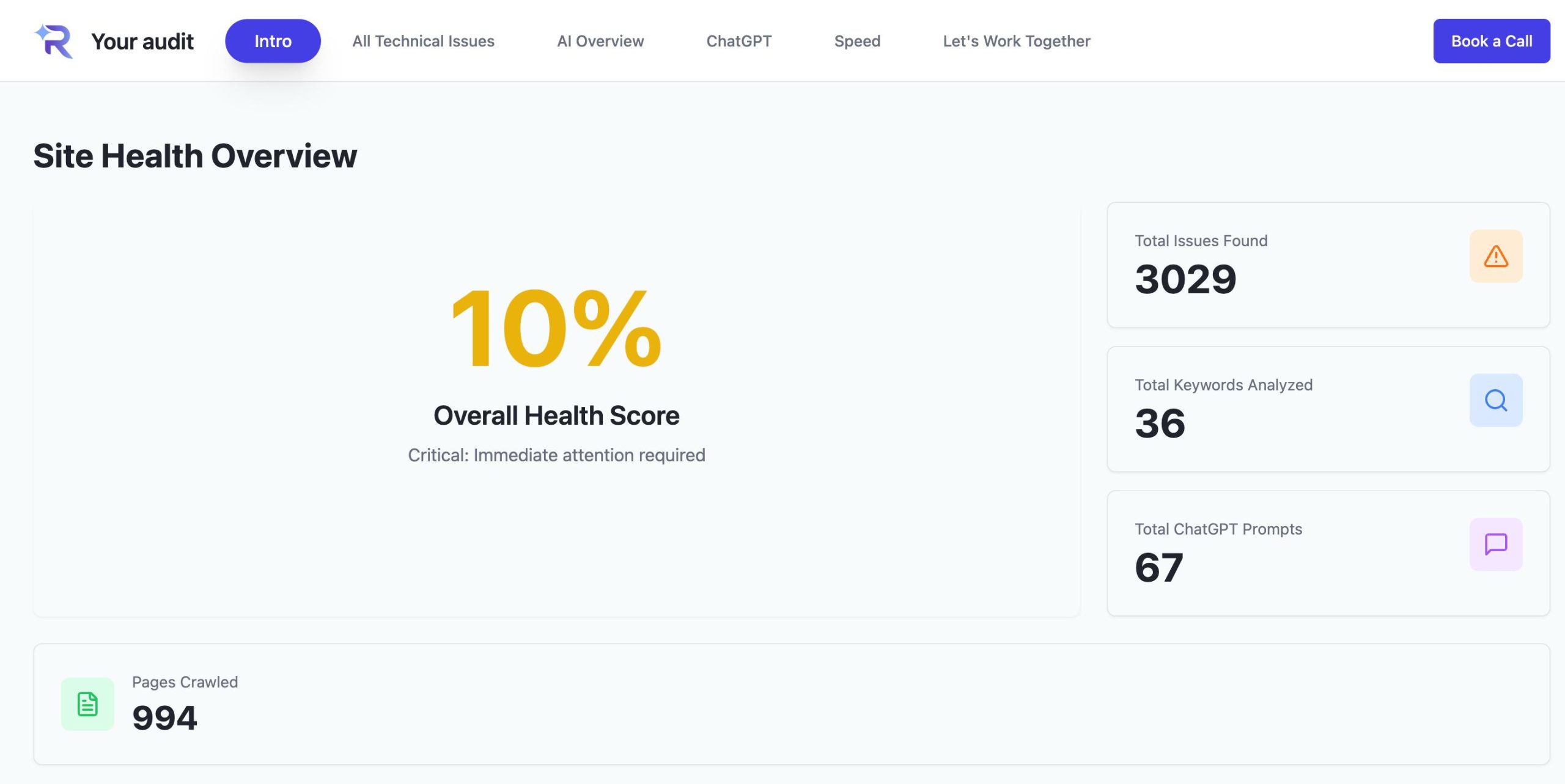 Check AI visibility, Google AI Overviews, and key technical issues.