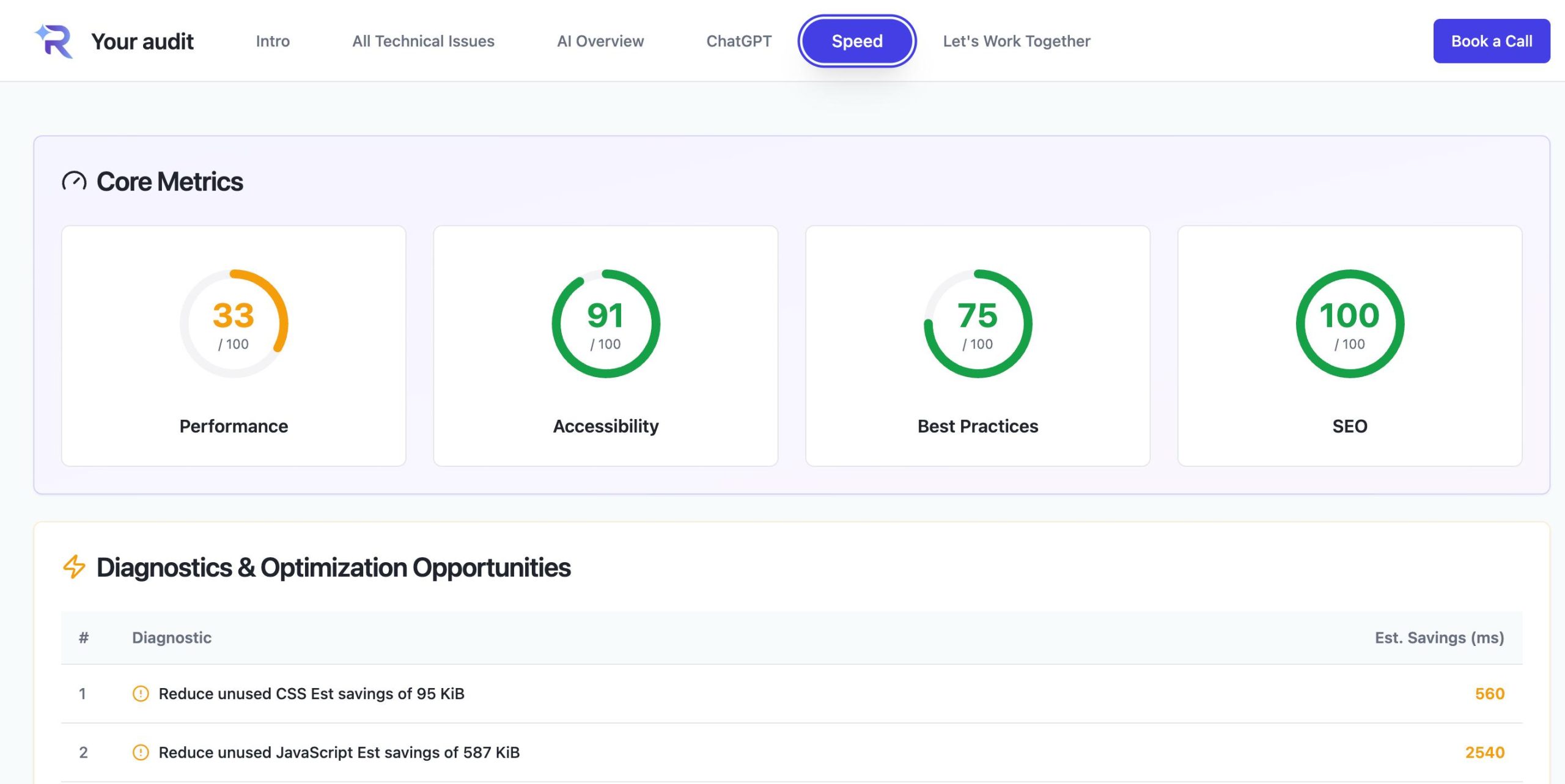 Our audit examines your Core Web Vitals, including load times, responsiveness, and visual stability. It identifies what slows your site down, from render-blocking scripts to oversized images and server delays. You receive a clear roadmap for improving performance, enhancing user experience, and boosting your search visibility.