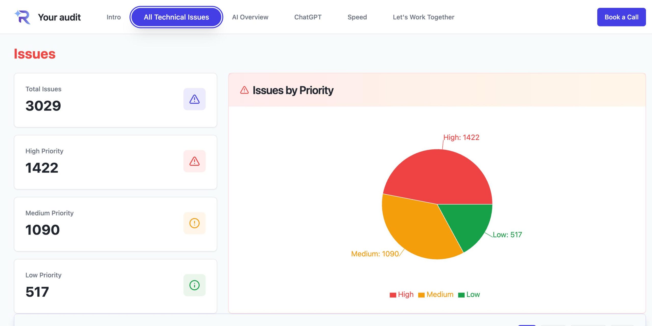 Our audit scans your entire website using the same logic as Google and leading AI platforms. It uncovers high-impact technical issues such as crawl errors, broken links, duplicate content, and missing tags. Each issue is clearly explained with its effect on performance and a recommended solution, prioritised by business impact so you always know where to focus first.