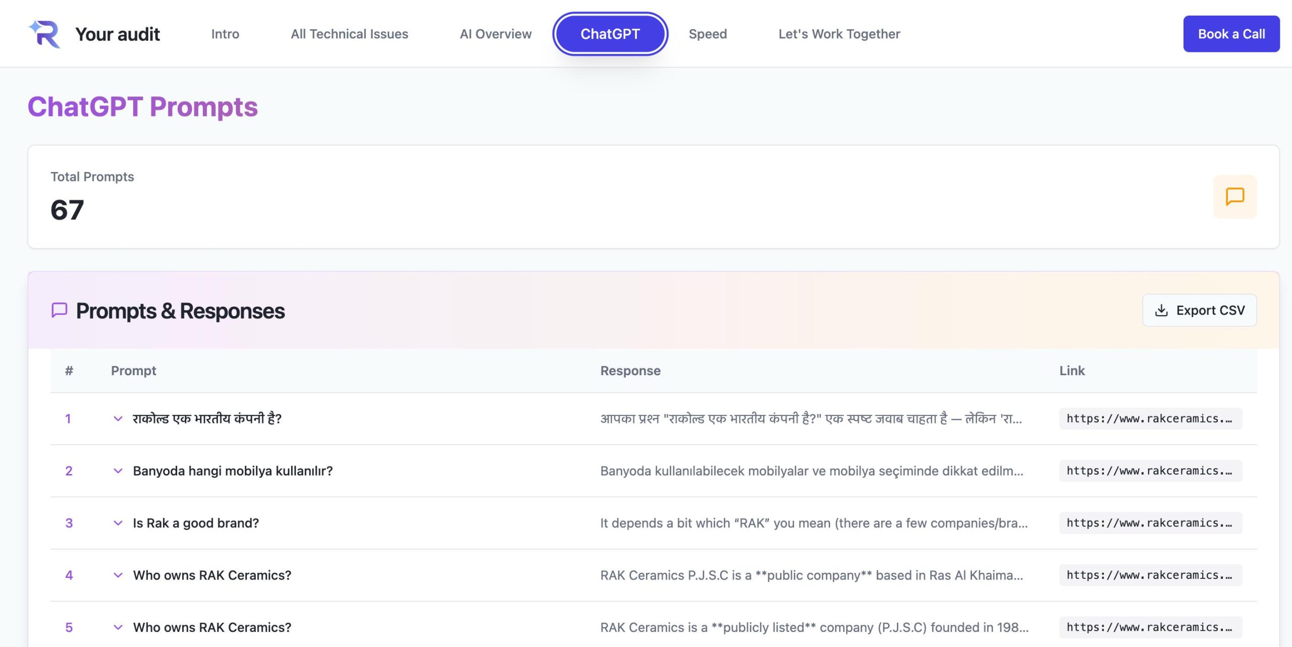 See how your site appears in Google’s AI Overviews and across language models such as ChatGPT, Claude, and Gemini. For example, when AI platforms are asked about products or services in your category, we identify whether your brand is included, how it is referenced, and even the sentiment of that mention. This level of insight goes beyond what traditional SEO tools can provide.